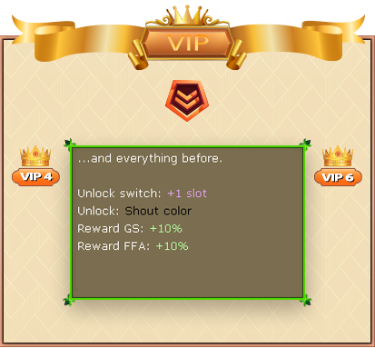 Feature Unlocks: Switch Equipment +1, Unlock Shout Color (Customize your chat messages) Rewards Boosts: Guild Siege Reward +10%, Free-for-All (FFA) Reward +10%, Cheer Slot + 1